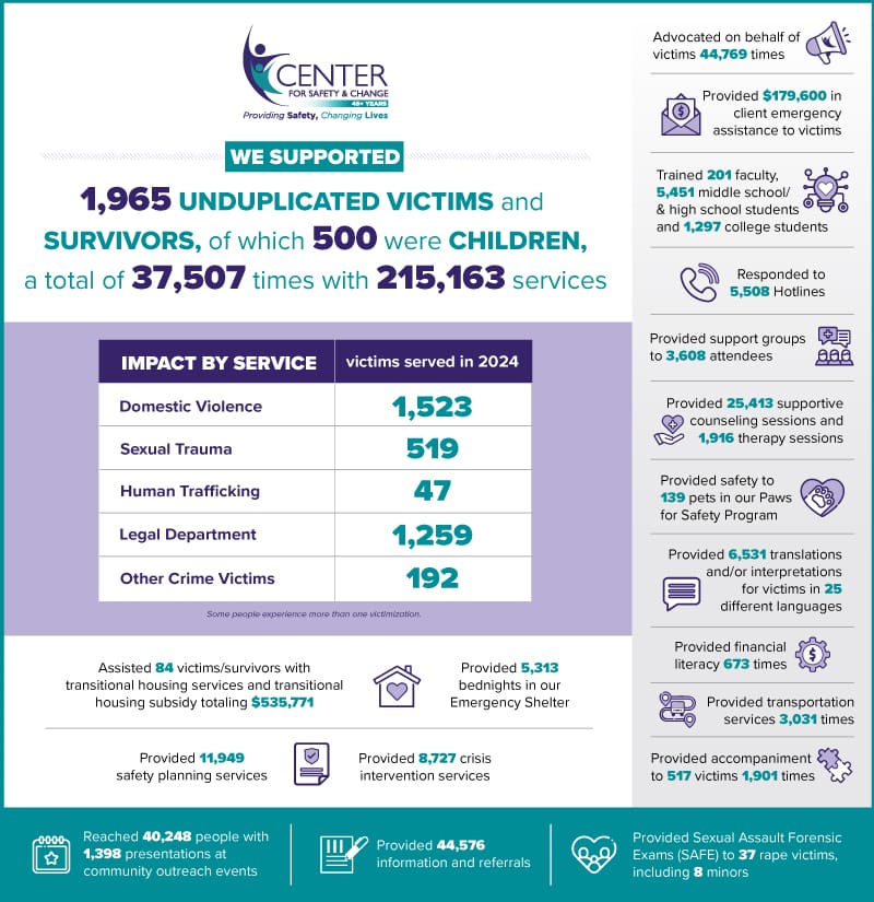 Center for Safety & Change provides critical services and support to women and all victims and survivors of gender-based violence and other crimes while working toward justice by creating social change.